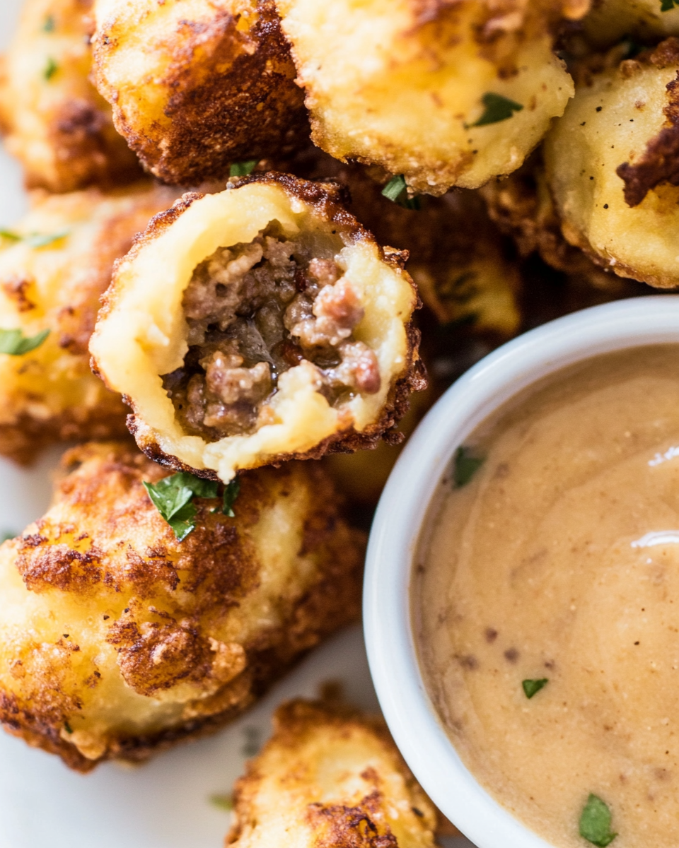 Golden potato dumpling bites stuffed with ground sausage and served with a rich onion gravy for dipping.